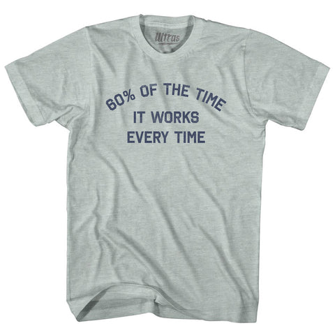 Product Story: 60% Of The Time It Works Every Time Adult Tri-Blend T-shirtProduct Description: 60% Of The Time It Works Every Time Adult Tri-Blend T-shirt Tri-Blend (Polyester, Rayon, Cotton) Buttery Smooth Soft Material Medium Weight Tee Soft Hand Print