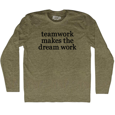 Product Story: Teamwork Makes The Dream Work Rage Font Adult Tri-Blend Long Sleeve T-shirtProduct Description: Teamwork Makes The Dream Work Rage Font Adult Tri-Blend Long Sleeve T-shirt Tri-Blend (Polyester, Rayon, Cotton) Buttery Smooth Soft Material Medium Weight Tee Soft Hand Print