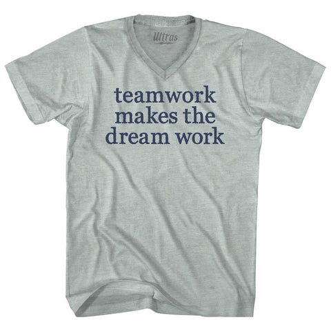 Product Story: Teamwork Makes The Dream Work Rage Font Adult Tri-Blend V-neck T-shirtProduct Description: Teamwork Makes The Dream Work Rage Font Adult Tri-Blend V-neck T-shirt Tri-Blend (Polyester, Rayon, Cotton) Buttery Smooth Soft Material Medium Weight Tee Soft Hand Print