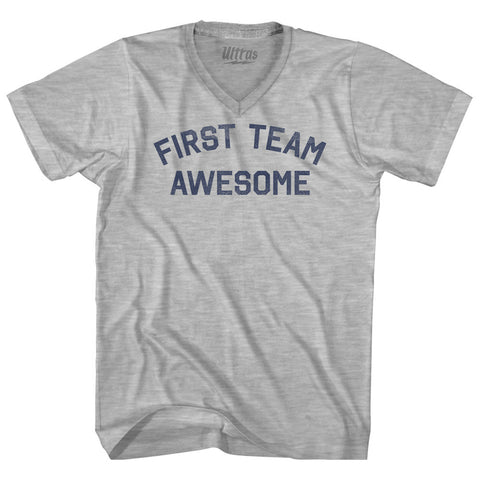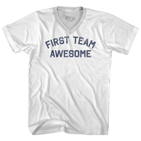 Product Story: First Team Awesome Adult Cotton V-neck T-shirtProduct Description: First Team Awesome Adult Cotton V-neck T-shirt Cotton Buttery Smooth Soft Material Medium Weight Tee Soft Hand Print