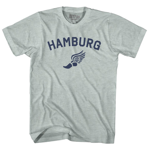 Product Story: Hamburg Running Track Winged Foot Adult Tri-Blend T-shirtProduct Description: Hamburg Running Track Winged Foot Adult Tri-Blend T-shirt Tri-Blend (Polyester, Rayon, Cotton) Buttery Smooth Soft Material Medium Weight Tee Soft Hand Print