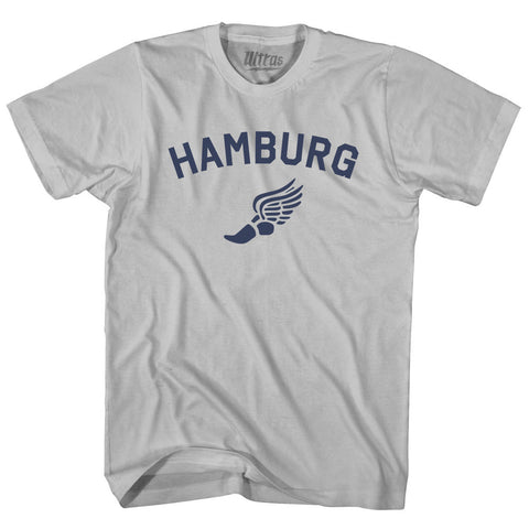 Product Story: Hamburg Running Track Winged Foot Adult Cotton T-shirtProduct Description: Hamburg Running Track Winged Foot Adult Cotton T-shirt Cotton (90% Cotton &10% Polyester) Buttery Smooth Soft Material Medium Weight Tee Soft Hand Print