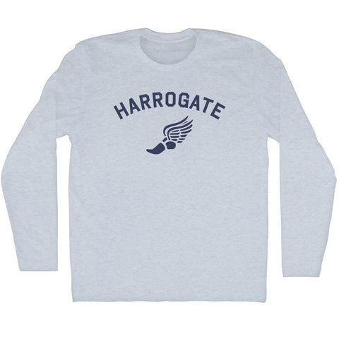 Product Story: Harrogate Running Track Winged Foot Adult Tri-Blend Long Sleeve T-shirtProduct Description: Harrogate Running Track Winged Foot Adult Tri-Blend Long Sleeve T-shirt Tri-Blend (Polyester, Rayon, Cotton) Buttery Smooth Soft Material Medium Weight Tee Soft Hand Print