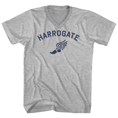 Product Story: Harrogate Running Track Winged Foot Adult Tri-Blend V-neck T-shirtProduct Description: Harrogate Running Track Winged Foot Adult Tri-Blend V-neck T-shirt Tri-Blend (Polyester, Rayon, Cotton) Buttery Smooth Soft Material Medium Weight Tee Soft Hand Print