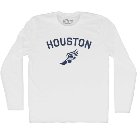 Product Story: Houston Running Track Winged Foot Adult Cotton Long Sleeve T-shirtProduct Description: Houston Running Track Winged Foot Adult Cotton Long Sleeve T-shirt Cotton (90% Cotton &10% Polyester) Buttery Smooth Soft Material Medium Weight Tee Soft Hand Print
