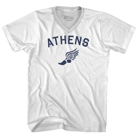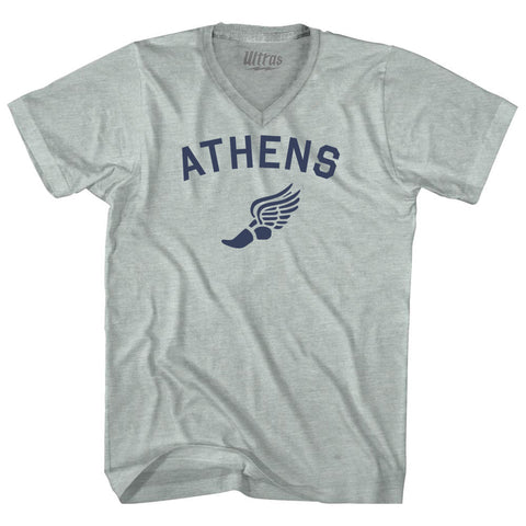 Product Story: Athens Running Track Winged Foot Adult Tri-Blend V-neck T-shirtProduct Description: Athens Running Track Winged Foot Adult Tri-Blend V-neck T-shirt Tri-Blend (Polyester, Rayon, Cotton) Buttery Smooth Soft Material Medium Weight Tee Soft Hand Print