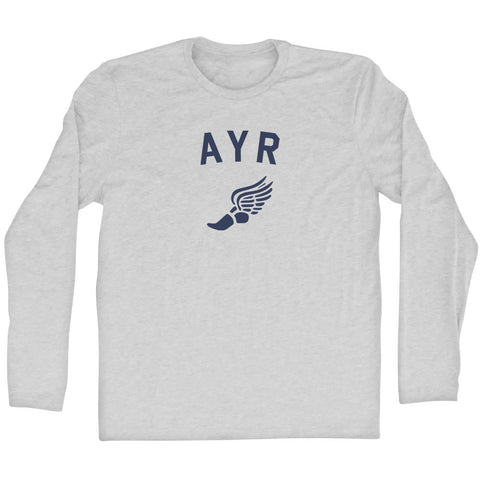 Product Story: Ayr Running Track Winged Foot Adult Cotton Long Sleeve T-shirtProduct Description: Ayr Running Track Winged Foot Adult Cotton Long Sleeve T-shirt Cotton Buttery Smooth Soft Material Medium Weight Tee Soft Hand Print