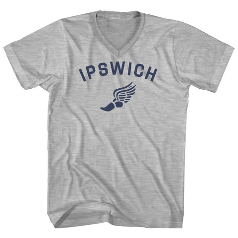 Product Story: Ipswich Running Track Winged Foot Adult Cotton V-neck T-shirtProduct Description: Ipswich Running Track Winged Foot Adult Cotton V-neck T-shirt Tri-Blend (Polyester, Rayon, Cotton) Buttery Smooth Soft Material Medium Weight Tee Soft Hand Print