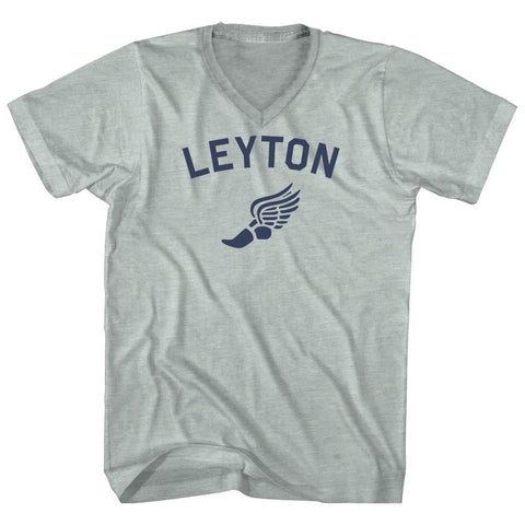 Product Story: Leyton Running Track Winged Foot Adult Tri-Blend V-neck T-shirtProduct Description: Leyton Running Track Winged Foot Adult Tri-Blend V-neck T-shirt Tri-Blend (Polyester, Rayon, Cotton) Buttery Smooth Soft Material Medium Weight Tee Soft Hand Print