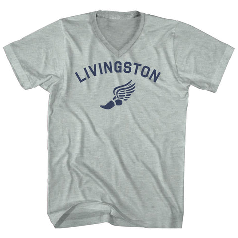 Product Story: Livingston Running Track Winged Foot Adult Tri-Blend V-neck T-shirtProduct Description: Livingston Running Track Winged Foot Adult Tri-Blend V-neck T-shirt Tri-Blend (Polyester, Rayon, Cotton) Buttery Smooth Soft Material Medium Weight Tee Soft Hand Print
