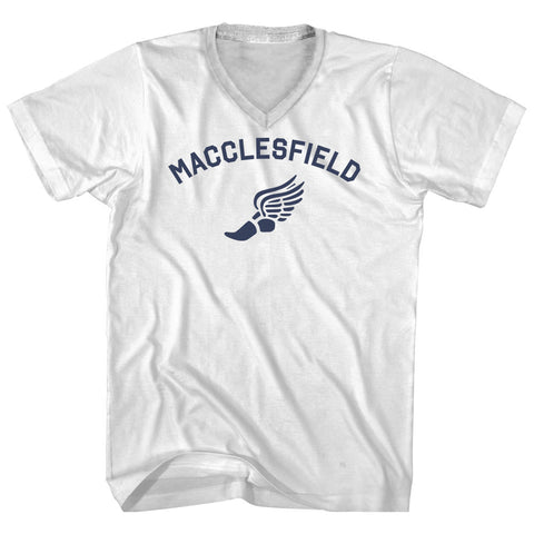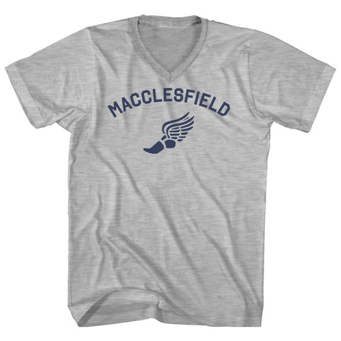 Product Story: Macclesfield Running Track Winged Foot Adult Cotton V-neck T-shirtProduct Description: Macclesfield Running Track Winged Foot Adult Cotton V-neck T-shirt Tri-Blend (Polyester, Rayon, Cotton) Buttery Smooth Soft Material Medium Weight Tee Soft Hand Print