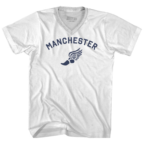 Product Story: Manchester Running Track Winged Foot-Adult Cotton V-neck T-shirtProduct Description:Manchester Running Track Winged Foot-Adult Cotton V-neck T-shirt