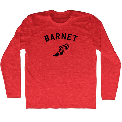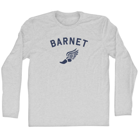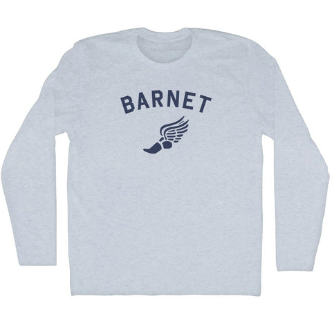 Product Story: Barnet Running Track Winged Foot Adult Tri-Blend Long Sleeve T-shirtProduct Description: Barnet Running Track Winged Foot Adult Tri-Blend Long Sleeve T-shirt Tri-Blend (Polyester, Rayon, Cotton) Buttery Smooth Soft Material Medium Weight Tee Soft Hand Print