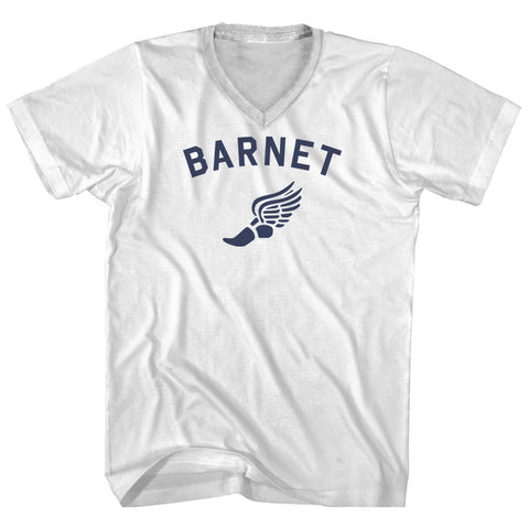 Product Story: Barnet Running Track Winged Foot Adult Cotton V-neck T-shirtProduct Description: Barnet Running Track Winged Foot Adult Cotton V-neck T-shirt Cotton Buttery Smooth Soft Material Medium Weight Tee Soft Hand Print