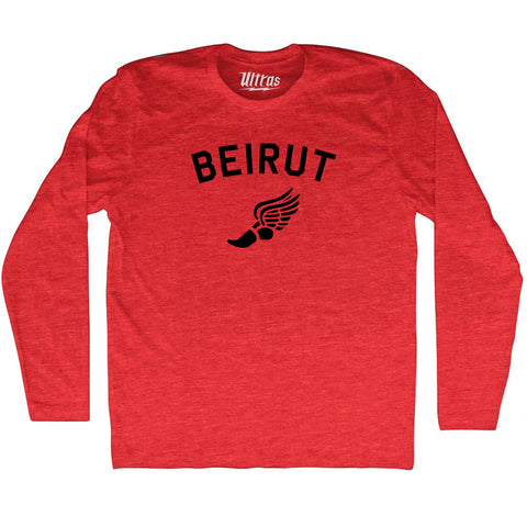 Product Story: Beirut Running Track Winged Foot Adult Tri-Blend Long Sleeve T-shirtProduct Description: Beirut Running Track Winged Foot Adult Tri-Blend Long Sleeve T-shirt Tri-Blend (Polyester, Rayon, Cotton) Buttery Smooth Soft Material Medium Weight Tee Soft Hand Print