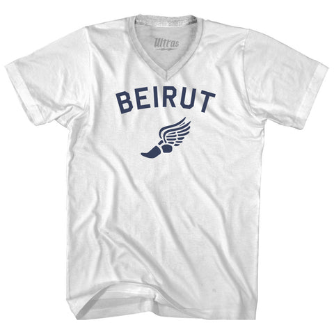 Product Story: Beirut Running Track Winged Foot Adult Cotton V-neck T-shirtProduct Description: Beirut Running Track Winged Foot Adult Cotton V-neck T-shirt Cotton Buttery Smooth Soft Material Medium Weight Tee Soft Hand Print