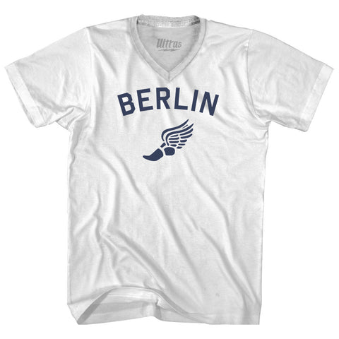 Product Story: Berlin Running Track Winged Foot Adult Tri-Blend V-neck T-shirtProduct Description: Berlin Running Track Winged Foot Adult Tri-Blend V-neck T-shirt Tri-Blend (Polyester, Rayon, Cotton) Buttery Smooth Soft Material Medium Weight Tee Soft Hand Print