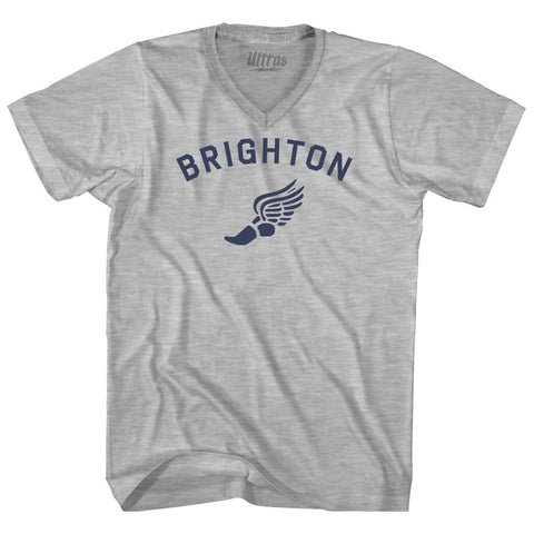 Product Story: Brighton Running Track Winged Foot Adult Cotton V-neck T-shirtProduct Description: Brighton Running Track Winged Foot Adult Cotton V-neck T-shirt Tri-Blend (Polyester, Rayon, Cotton) Buttery Smooth Soft Material Medium Weight Tee Soft Hand Print