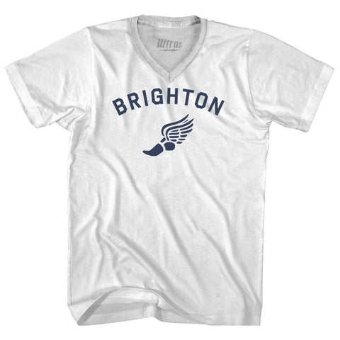 Product Story: Brighton Running Track Winged Foot Adult Cotton V-neck T-shirtProduct Description: Brighton Running Track Winged Foot Adult Cotton V-neck T-shirt Cotton Buttery Smooth Soft Material Medium Weight Tee Soft Hand Print