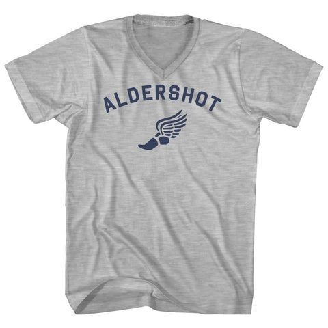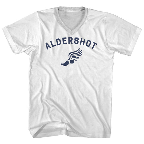 Product Story: Aldershot Running Track Winged Foot Adult Cotton V-neck T-shirtProduct Description: Aldershot Running Track Winged Foot Adult Cotton V-neck T-shirt Cotton Buttery Smooth Soft Material Medium Weight Tee Soft Hand Print