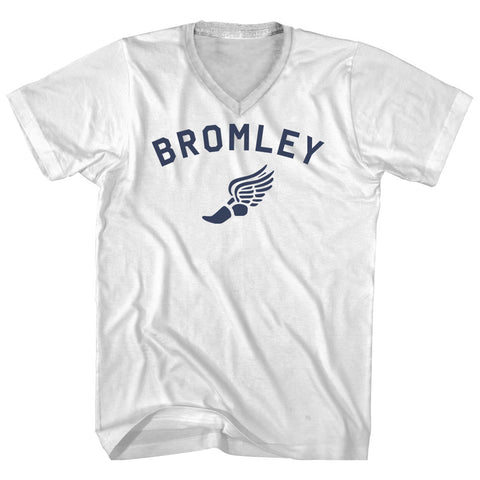 Product Story: Bromley Running Track Winged Foot Adult Cotton V-neck T-shirtProduct Description: Bromley Running Track Winged Foot Adult Cotton V-neck T-shirt Tri-Blend (Polyester, Rayon, Cotton) Buttery Smooth Soft Material Medium Weight Tee Soft Hand Print