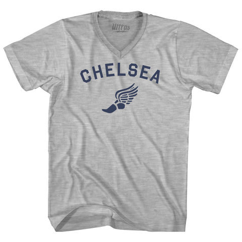 Product Story: Chelsea Running Track Winged Foot-Adult Cotton V-neck T-shirtProduct Description:Chelsea Running Track Winged Foot-Adult Cotton V-neck T-shirt