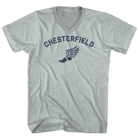 Product Story: Chesterfield Running Track Winged Foot Adult Tri-Blend V-neck T-shirtProduct Description: Chesterfield Running Track Winged Foot Adult Tri-Blend V-neck T-shirt Tri-Blend (Polyester, Rayon, Cotton) Buttery Smooth Soft Material Medium Weight Tee Soft Hand Print