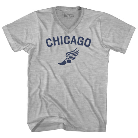 Product Story: Chicago Running Track Winged Foot Adult Tri-Blend V-neck T-shirtProduct Description: Chicago Running Track Winged Foot Adult Tri-Blend V-neck T-shirt Tri-Blend (Polyester, Rayon, Cotton) Buttery Smooth Soft Material Medium Weight Tee Soft Hand Print