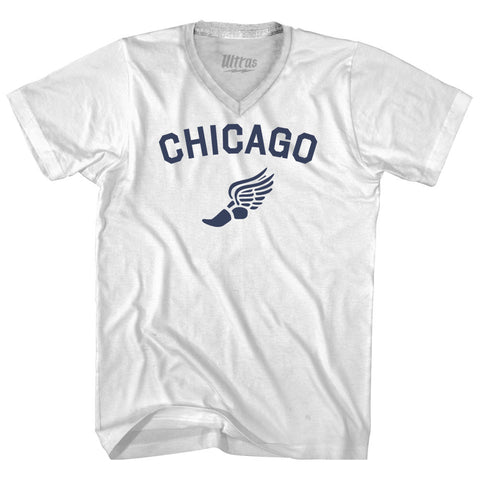 Product Story: Chicago Running Track Winged Foot Adult Cotton V-neck T-shirtProduct Description: Chicago Running Track Winged Foot Adult Cotton V-neck T-shirt Cotton Buttery Smooth Soft Material Medium Weight Tee Soft Hand Print