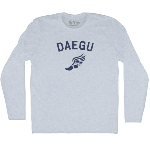 Product Story: Daegu Running Track Winged Foot Adult Tri-Blend Long Sleeve T-shirtProduct Description: Daegu Running Track Winged Foot Adult Tri-Blend Long Sleeve T-shirt Tri-Blend (Polyester, Rayon, Cotton) Buttery Smooth Soft Material Medium Weight Tee Soft Hand Print