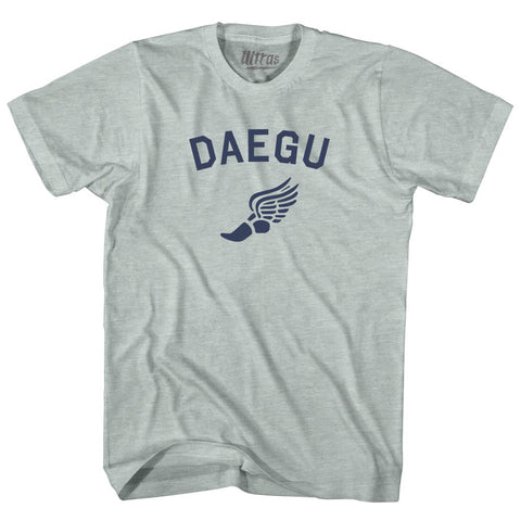 Product Story: Daegu Running Track Winged Foot Adult Tri-Blend T-shirtProduct Description: Daegu Running Track Winged Foot Adult Tri-Blend T-shirt Tri-Blend (Polyester, Rayon, Cotton) Buttery Smooth Soft Material Medium Weight Tee Soft Hand Print