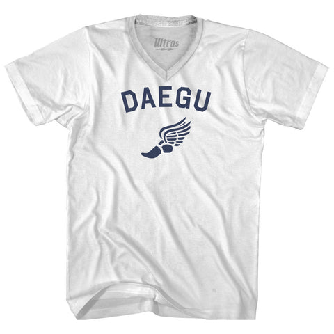 Product Story: Daegu Running Track Winged Foot Adult Cotton V-neck T-shirtProduct Description: Daegu Running Track Winged Foot Adult Cotton V-neck T-shirt Cotton Buttery Smooth Soft Material Medium Weight Tee Soft Hand Print