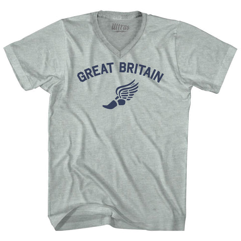 Product Story: Great Britain Track Running Winged Foot Adult Tri-Blend V-neck T-shirtProduct Description: Great Britain Track Running Winged Foot Adult Tri-Blend V-neck T-shirt Tri-Blend (Polyester, Rayon, Cotton) Buttery Smooth Soft Material Medium Weight Tee Soft Hand Print