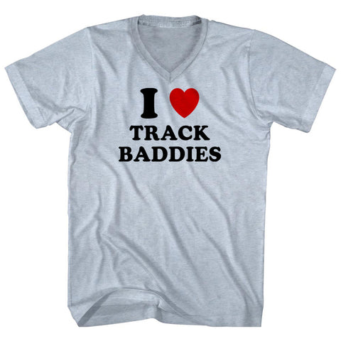 Product Story: I Heart Track Baddies Adult Tri-Blend V-neck T-shirtProduct Description: I Heart Track Baddies Adult Tri-Blend V-neck T-shirt Tri-Blend (Polyester, Rayon, Cotton) Buttery Smooth Soft Material Medium Weight Tee Soft Hand Print