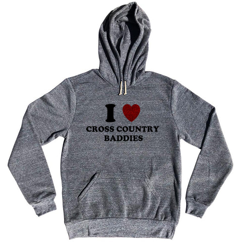 Product Story: I Heart Cross Country Baddies Cotton-Poly Blend HoodieProduct Description: I Heart Cross Country Baddies Cotton-Poly Blend Hoodie 6.5 oz. Tri-Blend Cozy Soft Material Pre-Shrunk Set-in sleeves Pouch front pocket Ribbed bottom band and sleeve cuffs