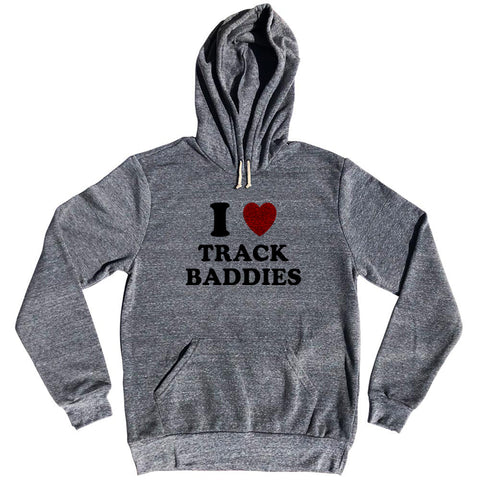 Product Story: I Heart Track Baddies Cotton-Poly Blend HoodieProduct Description: I Heart Track Baddies Cotton-Poly Blend Hoodie 6.5 oz. Tri-Blend Cozy Soft Material Pre-Shrunk Set-in sleeves Pouch front pocket Ribbed bottom band and sleeve cuffs