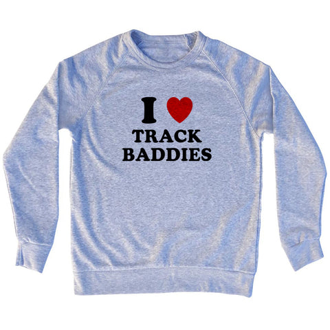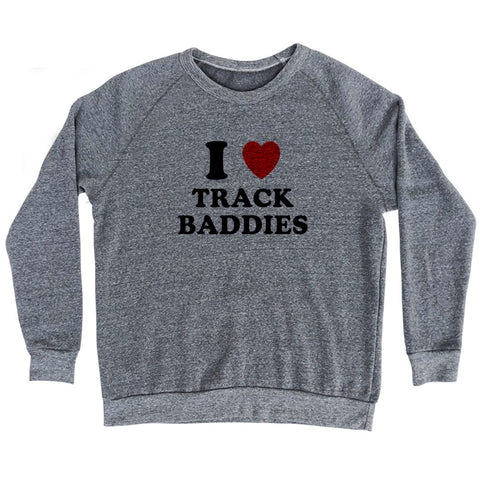 Product Story: I Heart Track Baddies Adult Tri-Blend SweatshirtProduct Description: I Heart Track Baddies Adult Tri-Blend Sweatshirt Tri-Blend (Polyester, Rayon, Cotton) Buttery Smooth Soft Material Medium Weight Tee Soft Hand Print