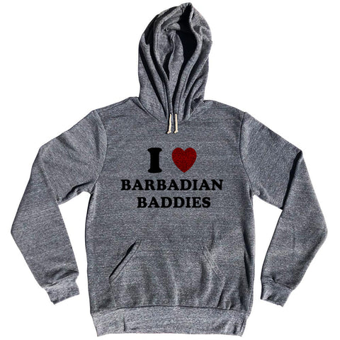 Product Story: I Heart Barbadian Baddies Cotton-Poly Blend HoodieProduct Description: I Heart Barbadian Baddies Cotton-Poly Blend Hoodie 6.5 oz. Tri-Blend Cozy Soft Material Pre-Shrunk Set-in sleeves Pouch front pocket Ribbed bottom band and sleeve cuffs