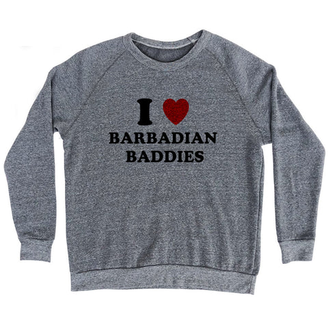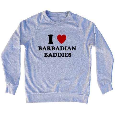 Product Story: I Heart Barbadian Baddies Adult Tri-Blend SweatshirtProduct Description: I Heart Barbadian Baddies Adult Tri-Blend Sweatshirt Tri-Blend (Polyester, Rayon, Cotton) Buttery Smooth Soft Material Medium Weight Tee Soft Hand Print