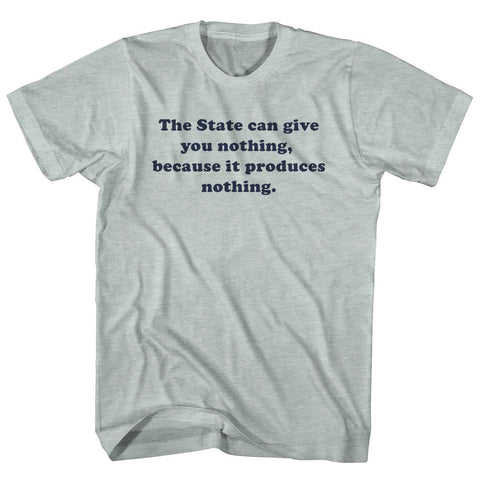 Product Story: The State Can Give You Nothing, Because It Produces Nothing. Quote Tees Adult Tri-Blend T-ShirtProduct Description: The State Can Give You Nothing, Because It Produces Nothing. Quote Tees Adult Tri-Blend T-Shirt Tri-Blend (Polyester, Rayon, Cotton) Buttery Smooth Soft Material