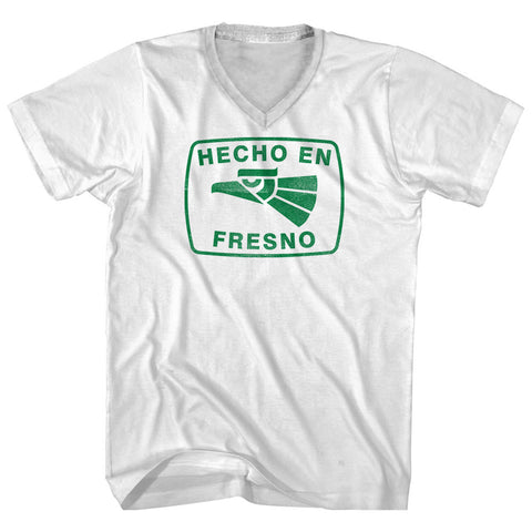 Product Story: Hecho En Fresno Eagle Adult Cotton V-neck T-shirtProduct Description: Hecho En Fresno Eagle Adult Cotton V-neck T-shirt Tri-Blend (Polyester, Rayon, Cotton) Buttery Smooth Soft Material Medium Weight Tee Soft Hand Print