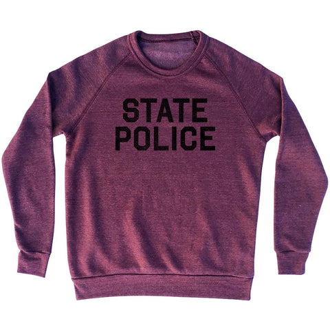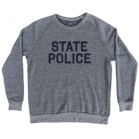 Product Story: State Police Adult Tri-Blend SweatshirtProduct Description: State Police Adult Tri-Blend Sweatshirt Tri-Blend (Polyester, Rayon, Cotton) Buttery Smooth Soft Material Medium Weight Tee Soft Hand Print