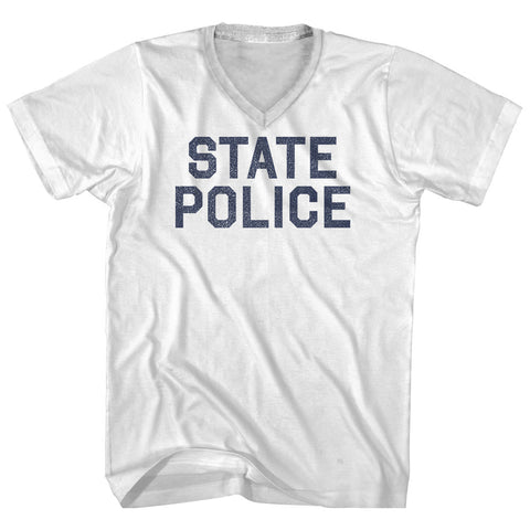 Product Story: State Police Adult Cotton V-neck T-shirtProduct Description: State Police Adult Cotton V-neck T-shirt Tri-Blend (Polyester, Rayon, Cotton) Buttery Smooth Soft Material Medium Weight Tee Soft Hand Print