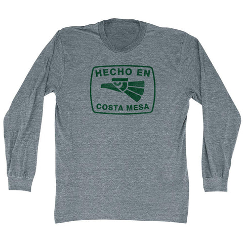 Product Story: Hecho En Costa Mesa Eagle Adult Tri-Blend Long Sleeve T-shirtProduct Description: Hecho En Costa Mesa Eagle Adult Tri-Blend Long Sleeve T-shirt Tri-Blend (Polyester, Rayon, Cotton) Buttery Smooth Soft Material Medium Weight Tee Soft Hand Print