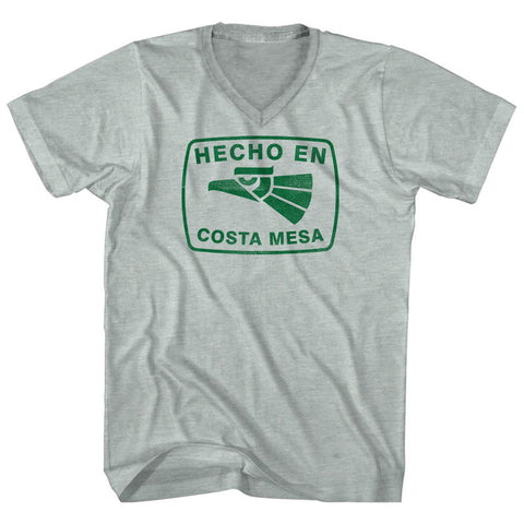 Product Story: Hecho En Costa Mesa Eagle Adult Cotton V-neck T-shirtProduct Description: Hecho En Costa Mesa Eagle Adult Cotton V-neck T-shirt Tri-Blend (Polyester, Rayon, Cotton) Buttery Smooth Soft Material Medium Weight Tee Soft Hand Print