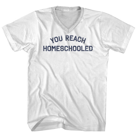 Product Story: You Reach Homeschooled Adult Cotton V-neck T-shirtProduct Description: You Reach Homeschooled Adult Cotton V-neck T-shirt Tri-Blend (Polyester, Rayon, Cotton) Buttery Smooth Soft Material Medium Weight Tee Soft Hand Print