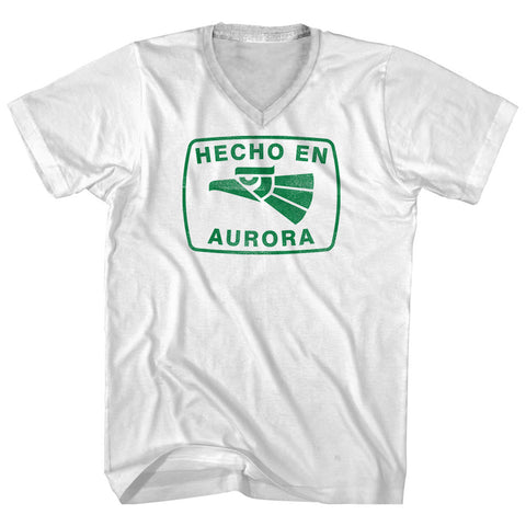 Product Story: Hecho En Aurora Eagle Adult Cotton V-neck T-shirtProduct Description: Hecho En Aurora Eagle Adult Cotton V-neck T-shirt Tri-Blend (Polyester, Rayon, Cotton) Buttery Smooth Soft Material Medium Weight Tee Soft Hand Print