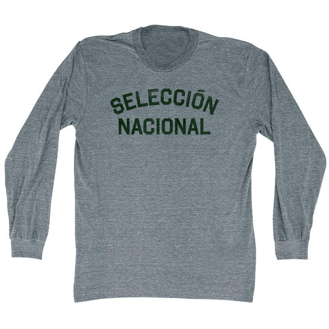 Product Story: Seleccion Nacional Hunter Green Text Adult Tri-Blend Long Sleeve T-shirtProduct Description: Seleccion Nacional Hunter Green Text Adult Tri-Blend Long Sleeve T-shirt Tri-Blend (Polyester, Rayon, Cotton) Buttery Smooth Soft Material Medium Weight Tee Soft Hand Print