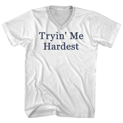 Product Story: Tryin' Me Hardest Rage Font Adult Cotton V-neck T-shirtProduct Description: Tryin' Me Hardest Rage Font Adult Cotton V-neck T-shirt Tri-Blend (Polyester, Rayon, Cotton) Buttery Smooth Soft Material Medium Weight Tee Soft Hand Print