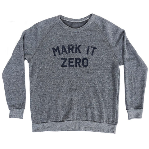 Product Story: Mark It Zero Adult Tri-Blend SweatshirtProduct Description: Mark It Zero Adult Tri-Blend Sweatshirt Tri-Blend (Polyester, Rayon, Cotton) Buttery Smooth Soft Material Medium Weight Tee Soft Hand Print